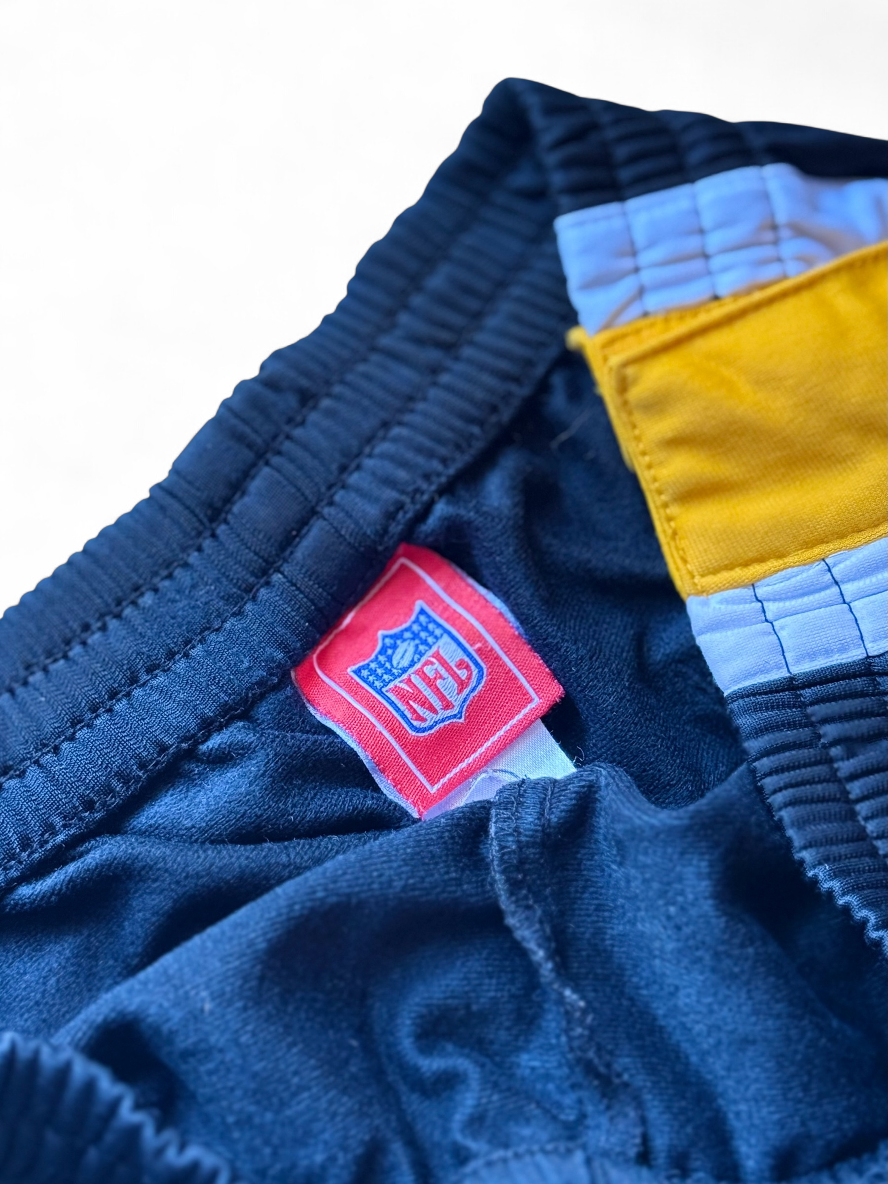 Modello sportivo nero con bande laterali gialle e bianche, scritta Steelers ricamata lungo la gamba e logo team applicato. Fondo con bottoni automatici laterali apribili, super vibe anni 2000 / streetwear.